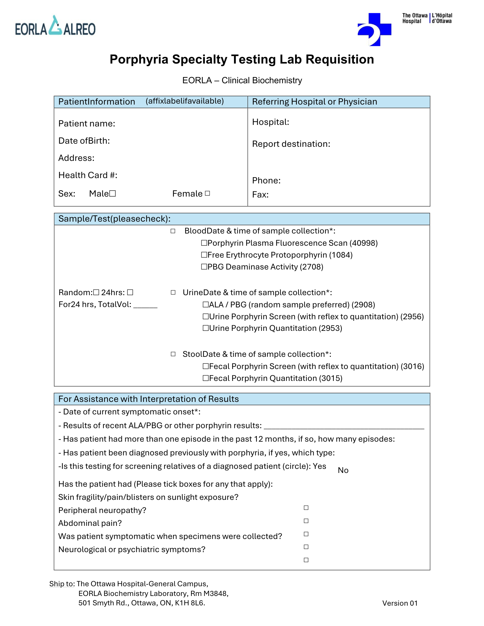 Dr David Colantonio and The Ottawa Hospital and Eastern Ontario Regional Laboratory Association developed a laboratory requisition form to support testing for all types of porphyria across Canada. This standardized requisition is designed to help patients and health-care providers access appropriate diagnostic testing.